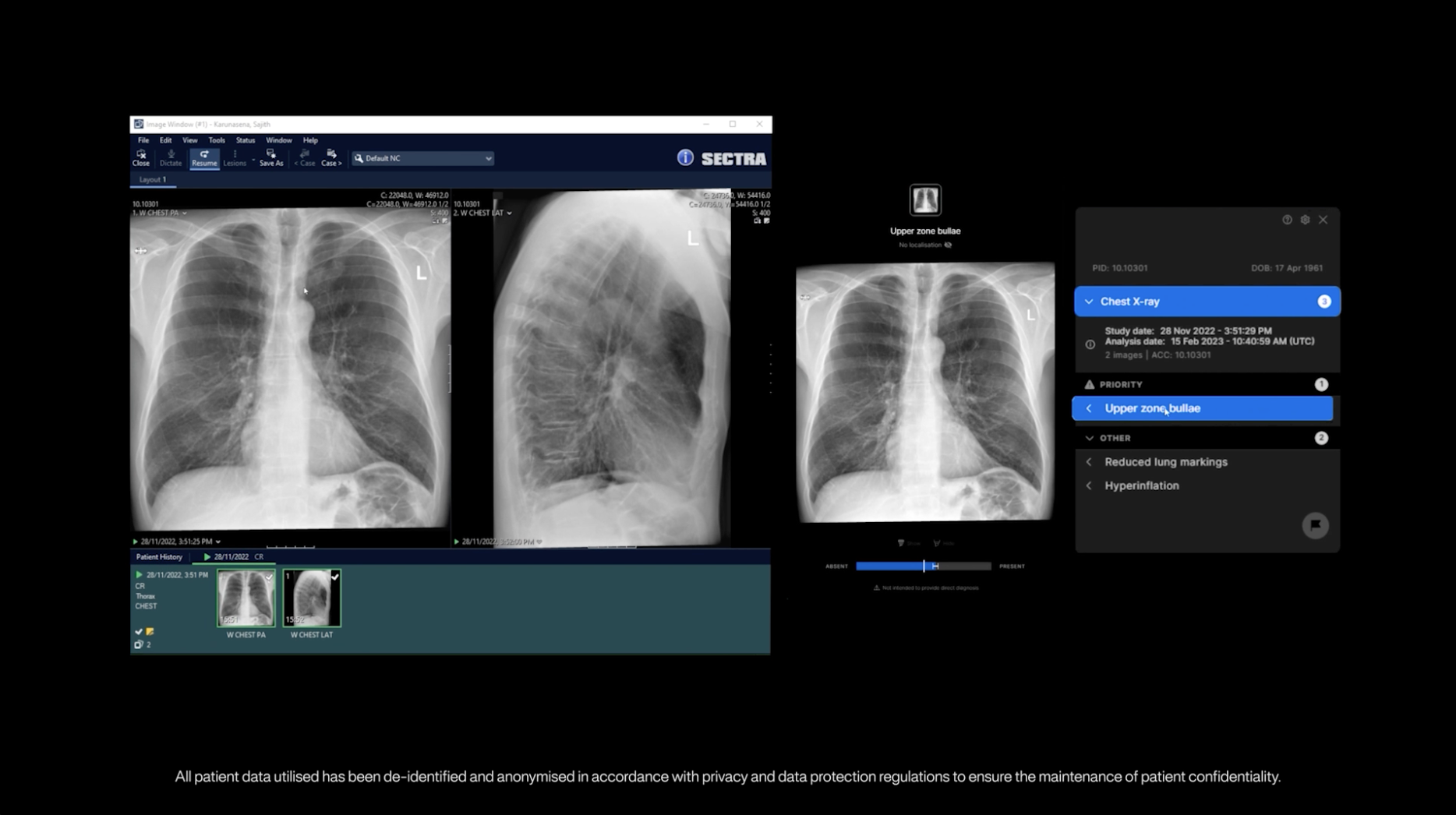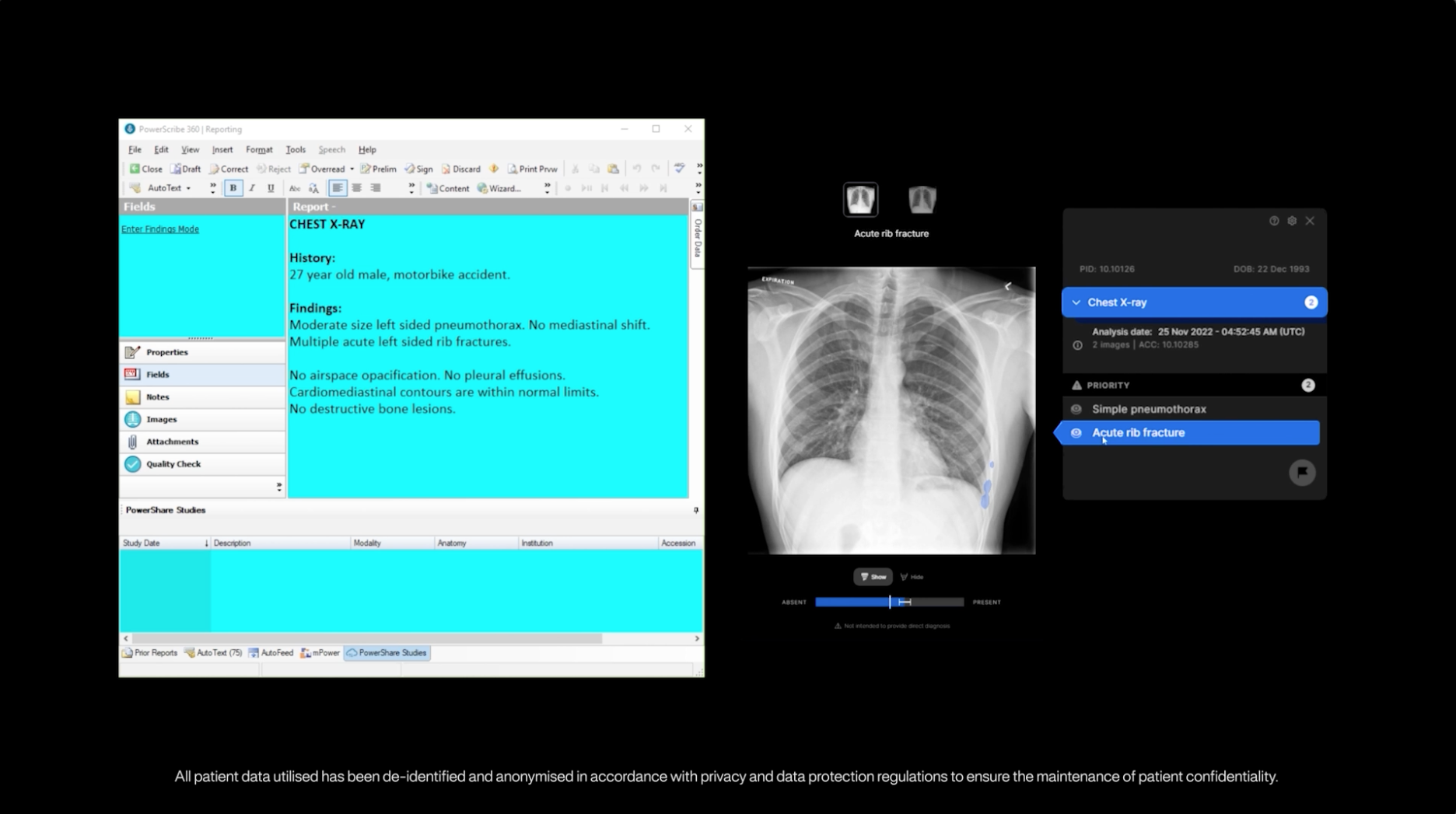 For urgent cases, the reporting tool prioritises critical findings, such as pneumothorax, as Sajith explained: “Notice that the pneumothorax, the most important finding has been described first, just as a radiologist would, and the important associated negative statement that there is no mediastinal shift to indicate tension is also included. The rib fractures, also an acute finding related to trauma, are also detailed in this initial section of the report. The standard normal statements to complete the report are then presented in a logical order afterwards.”